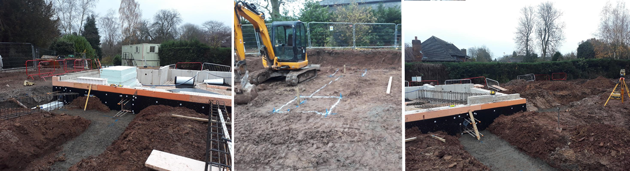 Working directly for the self-builder who was project managing the project. The project initially involved the positioning of the build on the plot and setting out to allow the groundworks contractor to complete the reduce level dig for the formation and sand blinding ahead of the passive foundation and EPS insulation being installed by the timber frame contractor commencing onsite. An existing structure in the form of a backfilled former pool with RC walls was discovered during the reduce level dig, requiring surveying for the design team to evaluate if the structure could be incorporated into the build. Following completion of the formation and blinding, attending site to set out for EPS insulation which forms the permanent in-situ shuttering of the build.