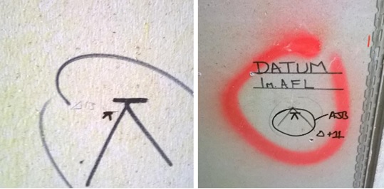 The photograph below shows the results of returning to site a previously completed site, AJB Setting Out Ltd had finished on the site, having completed setting out for the internal partitions and left Datums throughout the building on columns prior the the partitions contractor commencing.